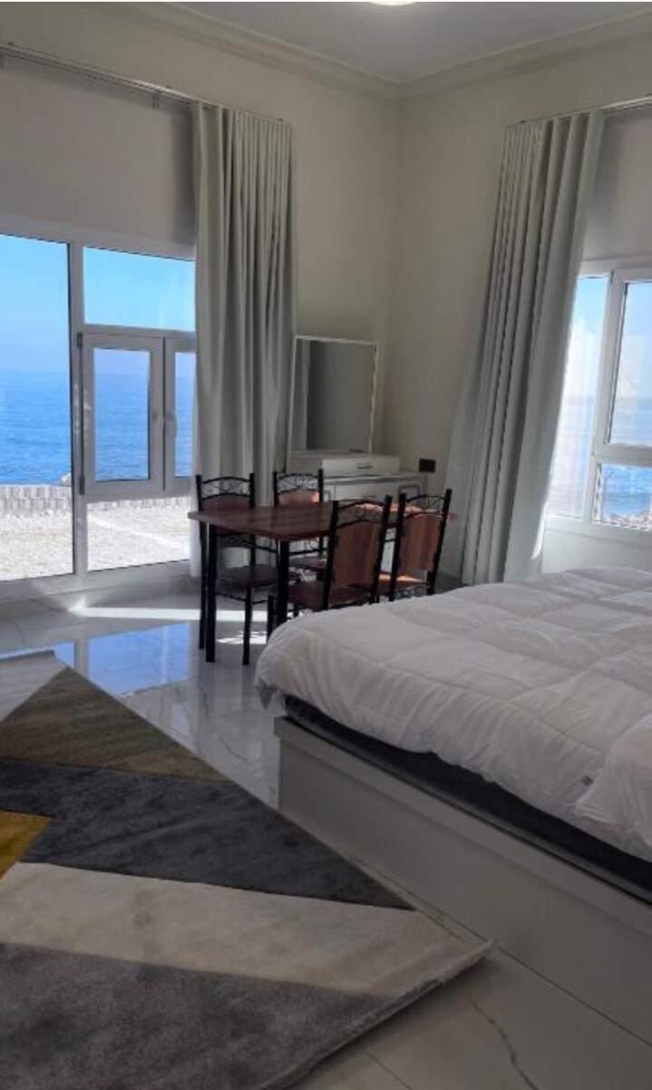 اطلاله على البحر مساحات خارجيه للجلوس كراسي ومظلات للجلوس قريب من الشاطي ووادي شاب وطيوي وهويه نجم وقريب من اللولو هايبر ماركت خدمه واي فاي مجانا نقدم القهوه والشاي والماء مجانا