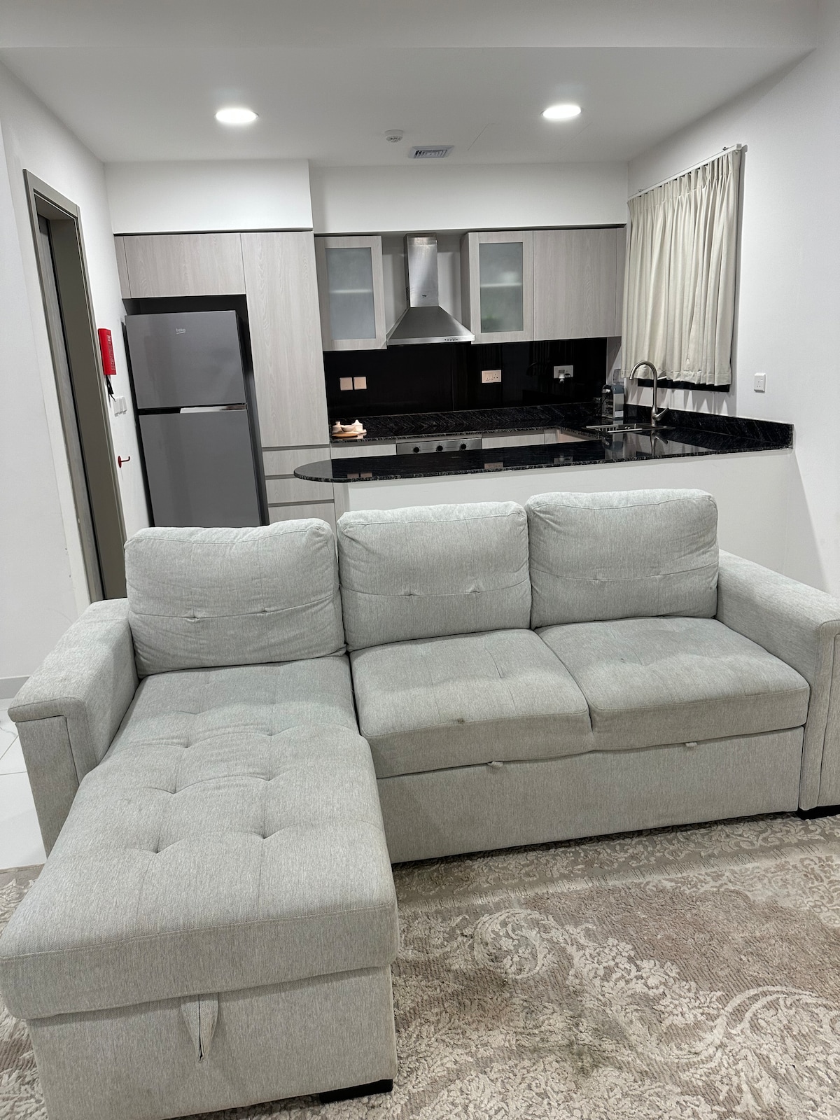 Elegant fully furnished self service one bedroom (1BR) apartment located in a secured community in Muscat Bay. A residential haven for those who are looking to get away from city life and enjoy pleasant moments with the family in a home surrounded by the natural beauty of Muscat. Guests can chill and relax with the park view from their balcony as they sip their favorite cup of coffee or chilled drinks.