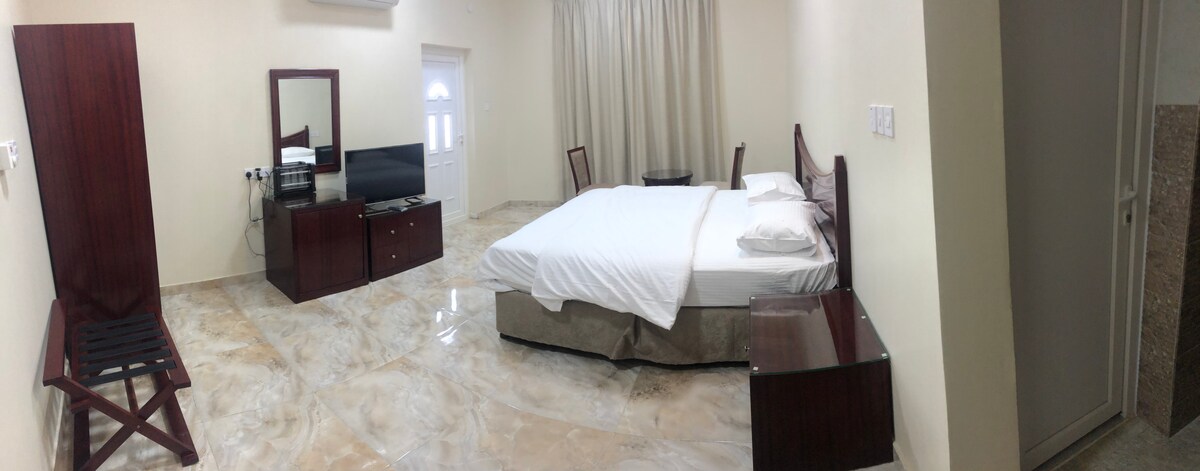 Unwind in this spacious and serene king suite, perfect for travelers seeking comfort and style. Enjoy plush bedding, a modern en-suite, air-conditioning, and free WiFi. Located near top cafés and green spaces, with easy access to Muscat’s landmarks. Ideal for couples or solo guests craving a peaceful city retreat.