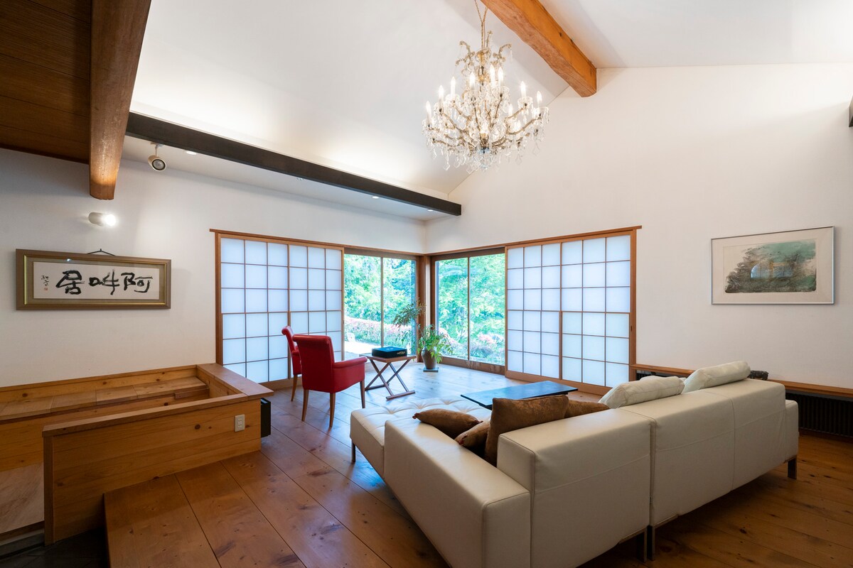 2024年7月にデザイナーによるリフォームをした、山中湖から徒歩11分の別荘地にある 「プライベートリゾート 富士」 という一日一組限定の宿です。 延床面積115㎡、3LDK のログハウスを基調とした和モダンデザイン一軒家で、 2階にあがると、リビングの窓から大きな富士山を望むことができ、富士山をバックに大きなバルコニーでBBQをしたり、木々に囲まれたバレルサウナを満喫した後には、そのまま外の休憩スペースで森林浴をしたりと、していただけます。庭には、大きな焚き火台があり、火を囲んで語らうこともできます。また、庭には高めの柵を設置しているため、愛犬を連れてきても逃げてしまう心配はございません。 部屋には90インチの大型スクリーンがあり、Prime Video、Youtube などが楽しめます。夜には、条件が良ければ満天の星空も見ることができます。