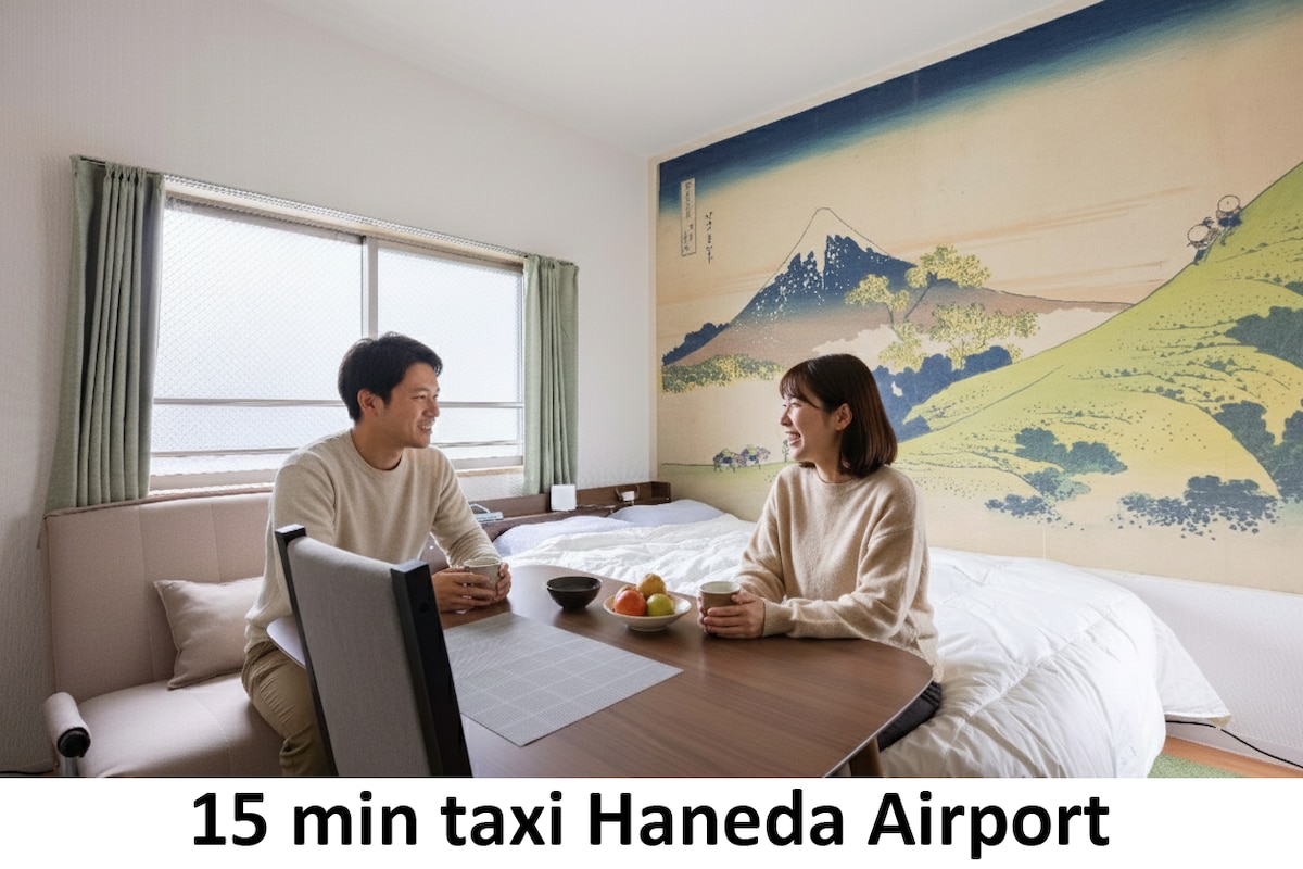 ー安静的住宅区,从宽敞的凉台看到富士山. 可以参观周围的町工场。 非常传统的日本房子,装饰都是日本匠人手工制作的.如果您喜欢建筑,这里是非常好的选择. ー到最近的车站(京急大森町站)走路15分左右,従JR大森站有公车、走路3分到家。从京急蒲田站Taxi1000日元左右到家 ー可容纳5人(卧室:1个双人床、榻榻米房间:日式寝具3个),分离式浴室和洗手间,厨房可使用 ー家里有快速无限WI-FI (不是pocket wifi),房子只属于您,不会跟别的房客共享. ー附近有一间超市,想买食材回家煮也都非常的方便,生活机能非常便利,晚上宁静不吵杂 -我们提供旅游参考资料.您可以用中日英文询问,我会尽快的答复您 ※预定之前,请确认好房子说明(4楼,没有电梯),民宿最近车站(京急线 大森町站走路15分左右)。从京急蒲田站Taxi1000日元左右到家