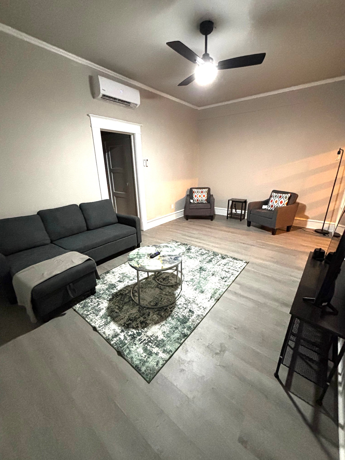 Kick back and relax in this stylish MCM space. We meticulously crafted this 2 bedroom, 1 bath apartment (1500 sq ft) using Mid-Century Modern design elements for a one-of-a-kind feel. Whether you're here on a work trip or traveling with friends/family look no further!! Every inch of this unit has been updated from refinished hardwoods to quartz countertops, all new appliances, & designer furniture. Property has washer/dryer in the unit & off-street parking. This is the ONE!! ☺️ 🏡 ✨