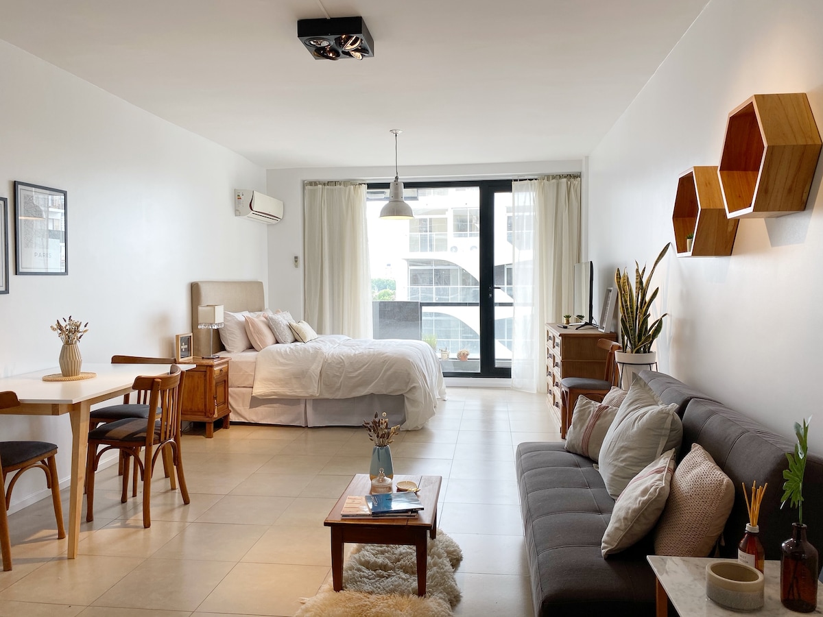 Estamos de estreno!. Quedó hermoso, te vas a enamorar de este studio apartment!. Armado y decorado con mucho amor y buen gusto, con detalles elegantes y sutilezas especialmente diseñadas para el confort y el disfrute del huesped. Balcón con vista panorámica donde se puede ver la puesta de Sol☀️. Televisión HD enorme de 55 pulgadas. Excelente ubicación con todos los medios de transporte público en frente al edificio y a 4 cuadras del Shopping del Abasto.