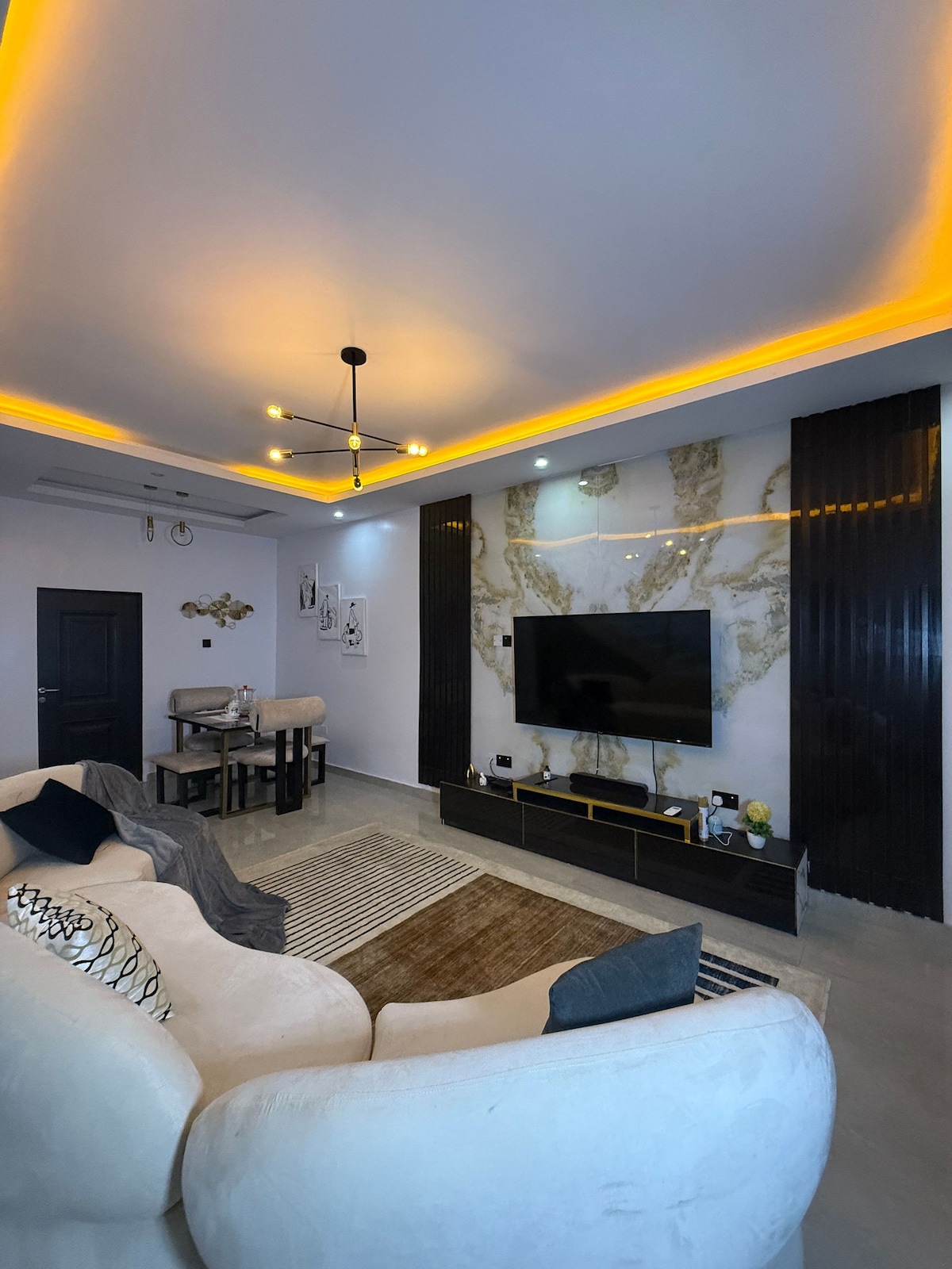 A well built 2bedroom serviced apartments in a repository environment not too far from the airport with tared road all through from airport to main building and also from alagbaka to the main building with the following features : Ample parking space Central air condition unit for living room &fans for rooms Standby generator Condusive environment 50 inches smart TV Modern sofa Gas and oven cooker Car pick up from airport/others Special service request