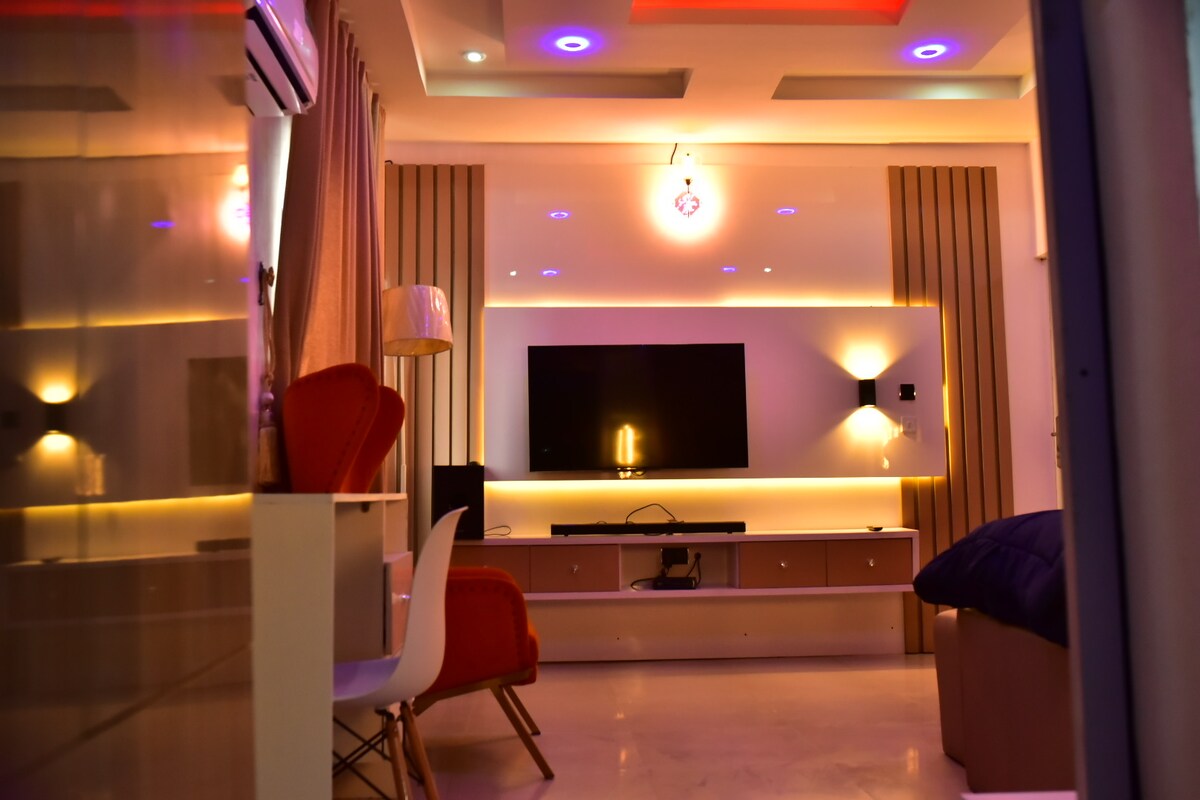 Cozy living room with a smart TV, plush sofa, and elegant decor.