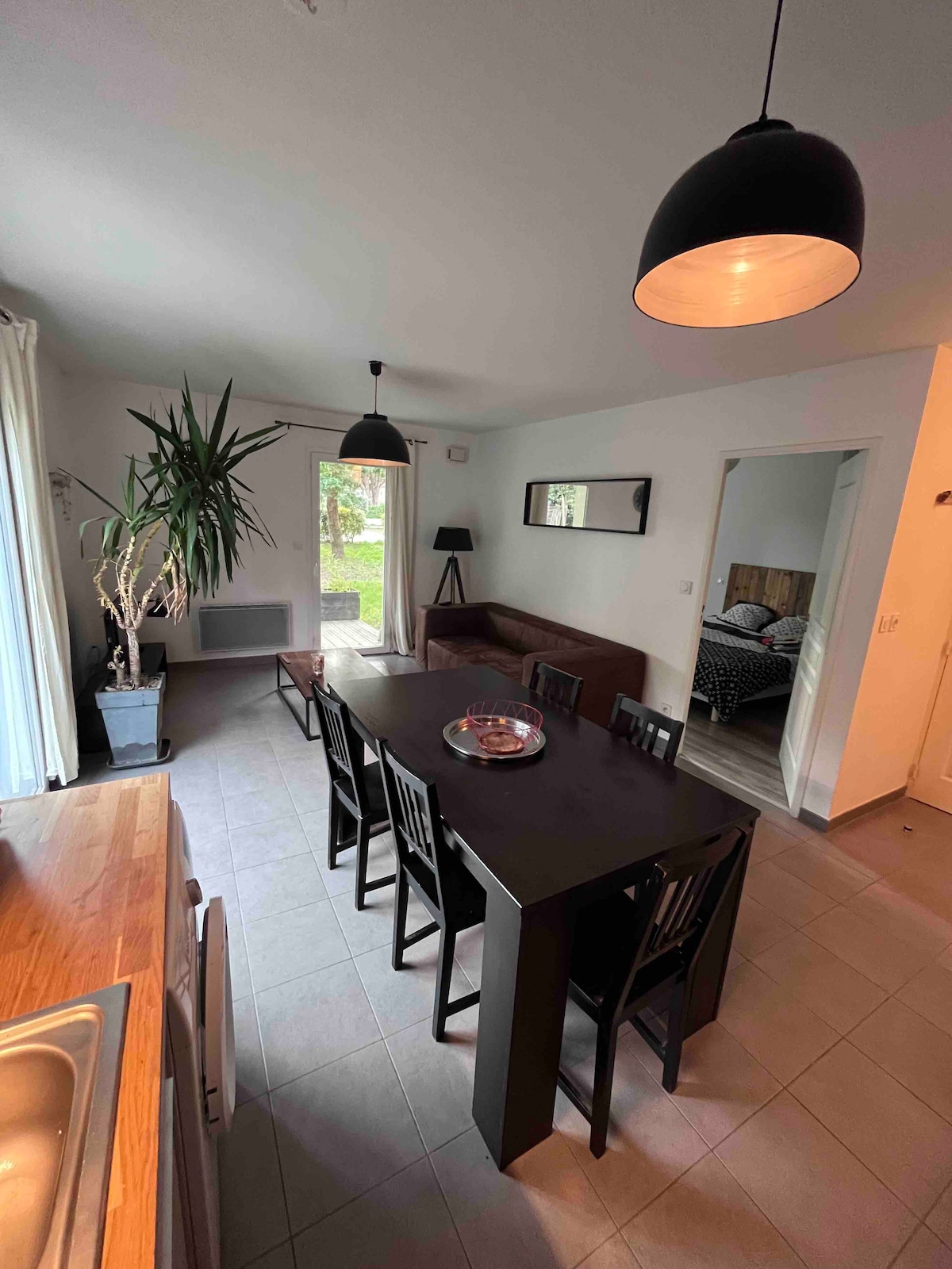 T2 a 4 kilomètres de la plage, accessible par pistes cyclables, ou navettes gratuites. Il est situé à deux pas de la forêt, permettant des ballades. Une grande terrasses en L, sans vis à vis offre ainsi qu’un salon de jardin. Il est équipé de plaque à induction, d’un four, d’un micro onde, de réfrigérateur/congélateur, télévision etc. La salle de bain dispose d’un grand miroir, un WC et une douche. La chambre est spacieuse avec un lit en 140 et une grande armoire.
