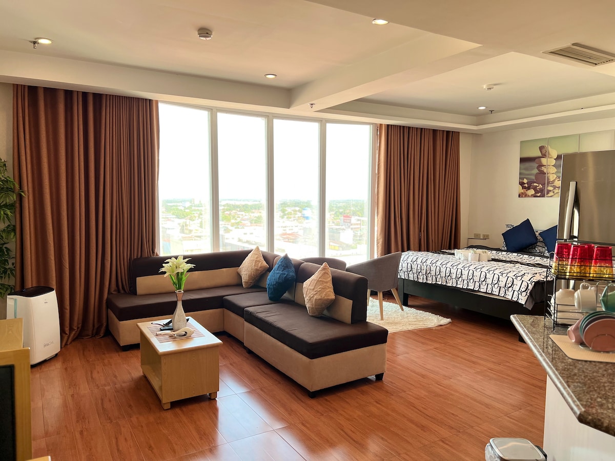 2nd floor studio with patio above pool, Executive Internet package, 55" Samsung Smart 4K TV, fully equipped kitchen with new cookware, utensils, and flatware. New drip coffee maker, microwave. A non-smoking unit with walkout balcony overlooking the pool area. La Grande Residence has become the premier choice for both business and tourists visiting Clark Freeport and the Pampanga area. Kick back and relax in this calm, secure, and stylish space.