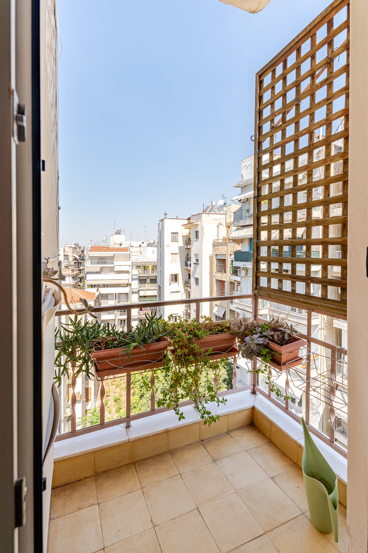 Elegant, bright airy 60m2 apartment in the heart of Thessaloniki. A peaceful escape in an old building without elevator in 4rth floor, in a friendly neighborhood with many restaurants, coffee shops, commercial shops within walking distance. Two aircondition units warm up the whole apartment . Relax in a unique private covered veranda- overlooking at the back side of the building- a special net covers the whole balcony to exclude birds. Enjoy our wifi Fiber Optic 100Mbps speed