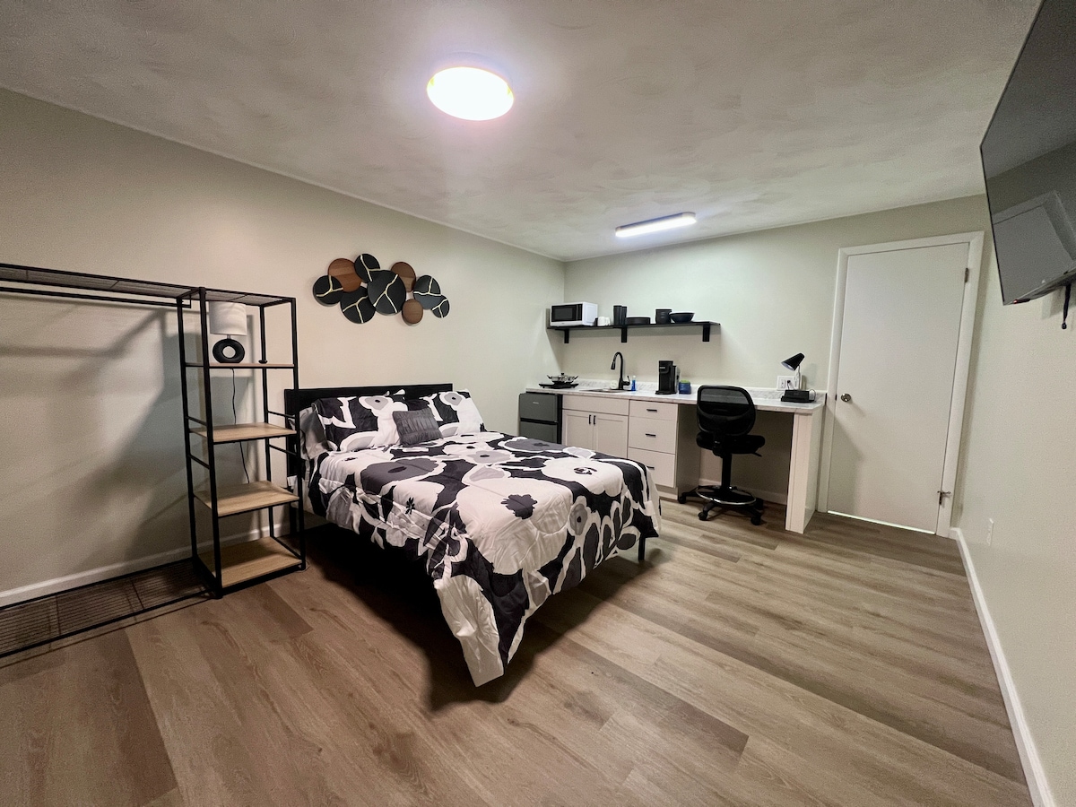 Welcome to our stylish studio apartment – the perfect retreat for solo travelers or cozy couples. This well-appointed space boasts a practical kitchenette with a cooktop, microwave, refrigerator, and sink for all your culinary needs. Unwind in the modern bathroom with shower, and rest comfortably on the full-size bed. The thoughtful inclusion of a desk, computer chair, and closet area ensures both productivity and relaxation during your stay. Experience a blend of convenience and comfort.