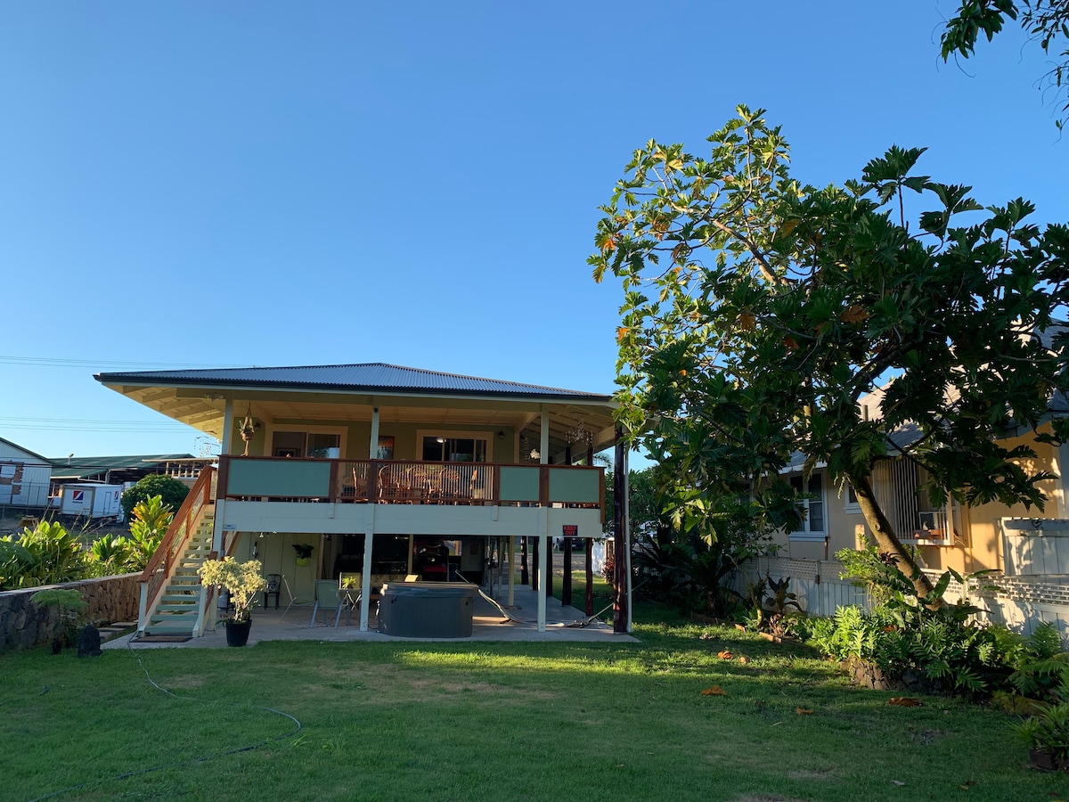 This property sits on Kalanianaole Park which is on Hilo Bay. Sit on the back porch and soak in the beautiful view. The Ice Pond is next door ( a local swimming spot) and connects to the ocean. Close to town, just 2 miles from the airport close to shopping and restaurants. We are in a busy area and there is noise but the location is convenient and the house is well equipped. If you are sensitive to noise this is not your house. If you want charm on the ponds of Hilo this is your house!