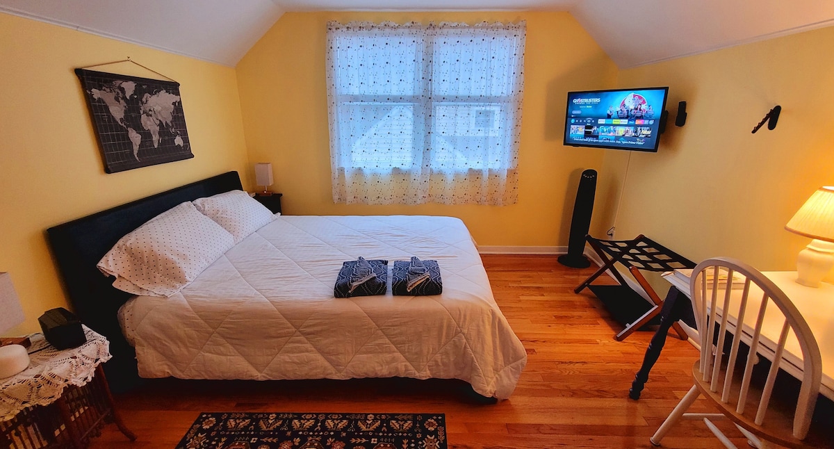 SYR second floor studio and first floor book nook in detached carriage house next to owner occupied home. Private. Modern. Authentic. Near SU, downtown, and hospitals. House backs up to beautiful Elmwood park and our family garden. Perfect for 1 or 2 (potentially 3). Great for coffee, book, and nature lovers. Stairwell to apartment is narrow and could be a challenge for some. Access to fenced private family garden if you like. We are often around and outside but the apt is very private.