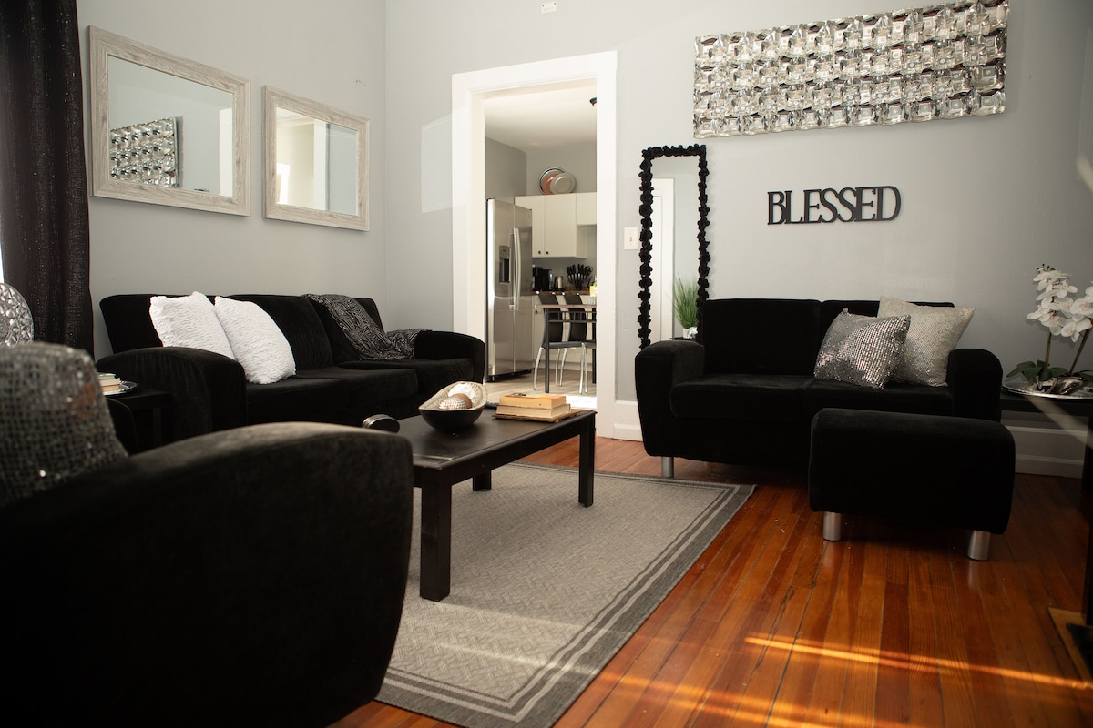 Welcome to HardingBNB, a completely renovated duplex with everything you need in a home away from home. Outfitted with three bedrooms, a pull-out, and one bath, this apartment can fit up to seven people. Enjoy all cable and premium channels on a 65" TV in the living room and free internet access. Utensils and appliances needed to cook and bake are also available in a modern kitchen. And for the traveling employee, an office just on the other side of the kitchen is available for you to work.