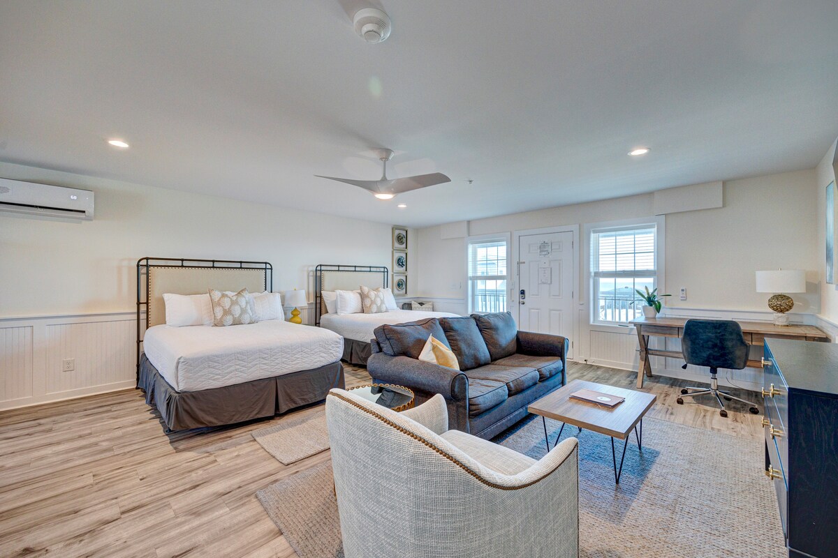Introducing Topsail Island's newest hotel built in 2022, where luxury meets convenience and breathtaking views of the ocean await you. This ADA and Pet Friendly suite has two queen beds, a modern kitchen with stainless steel appliances, a dining area, living area with sleeper-sofa, club chairs and a 75" Smart TV, as well as a walk-in/roll-in shower. This private 1st floor hybrid hotel suite with 700 sqft of modern living space is the perfect place to unwind and vacation.