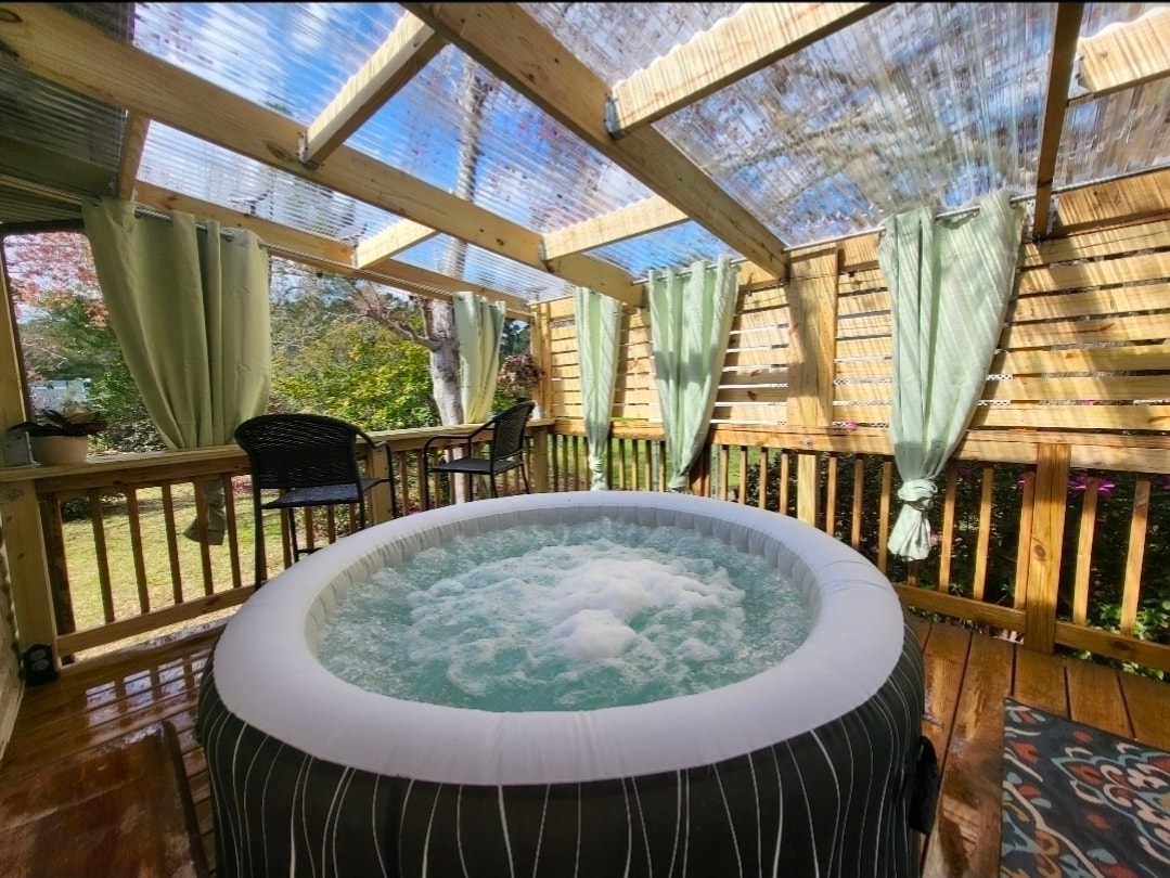 Virginia’s Country Cottage, a charming guest house constructed in 2020, nestled on 40 acres behind our residence. Enjoy your own private yard and relax on the new outdoor patio featuring a gas fire pit. This 950-square-foot retreat offers tranquility in a secluded setting while still being close to Western Blvd. Nearby amenities include restaurants, grocery stores, a movie theater, mall, and Walmart, making it an ideal spot for those visiting cities surrounding onslow county.