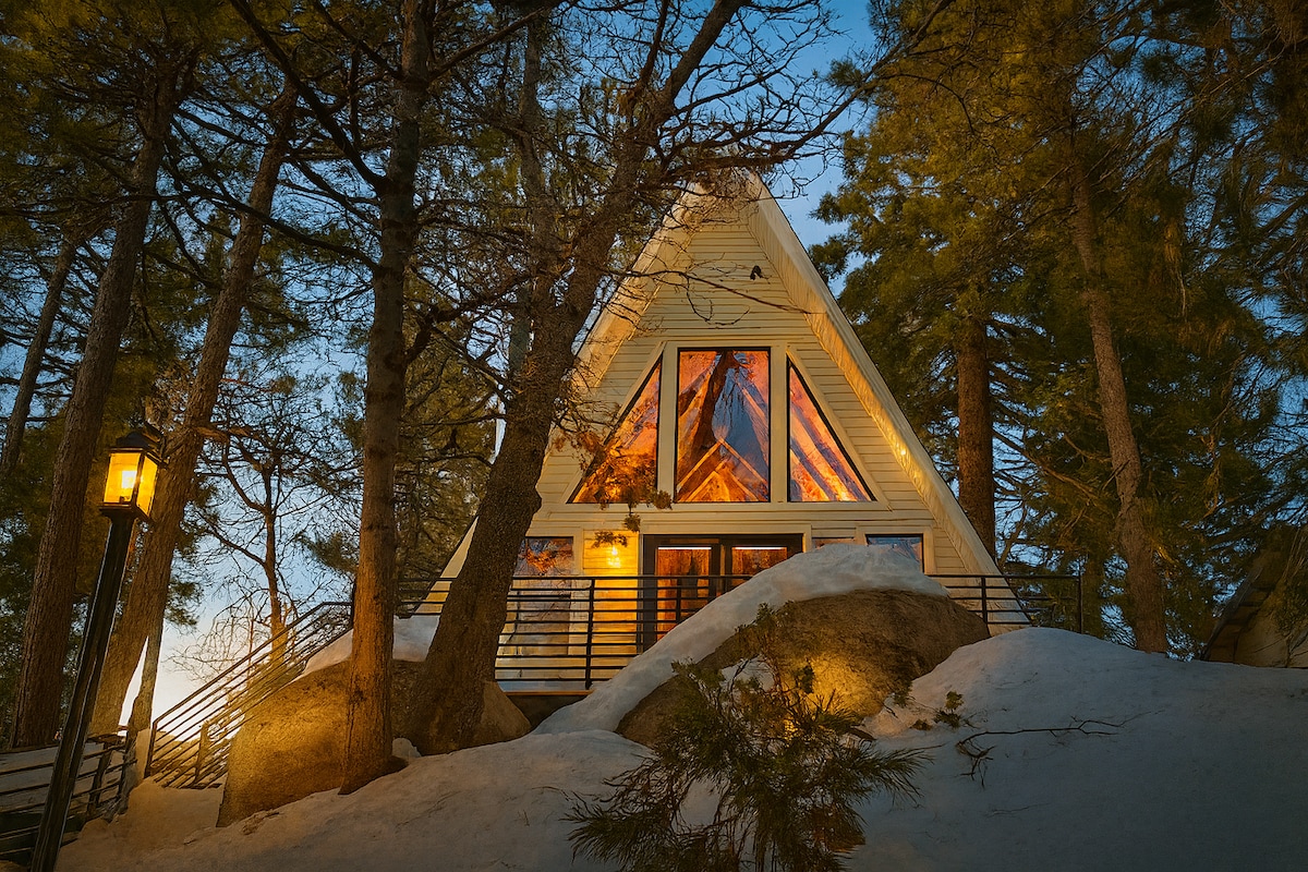 Experience a winter escape at Alpine Vista, an A frame chalet with two king suites, six beds, 2 Gb fiber WiFi, and newly remodeled floors. Enjoy snow covered pines framed through floor to ceiling windows, relax by the cozy gas fireplace, and take in the quiet winter forest. Perfect for families, romantic getaways, and remote work retreats seeking a peaceful mountain escape. Minutes from Snow Valley, SkyPark at Santa’s Village, and snow tubing, with sledding only steps from the chalet.