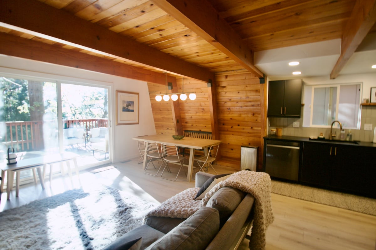 Relax and get away at this beautiful A-frame that combines the peacefulness of a cozy cabin along with easy access to all that Lake Arrowhead has to offer. Our home has been updated and remodeled while still maintaining the original details that make this A-frame so special. Our home has lake access for registered guests. Please inquire about wristbands if you’d like to use the lake. Featured on Apartment Therapy!