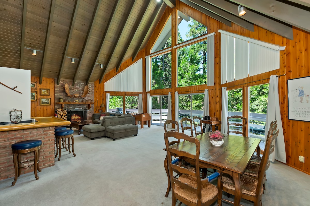 This house has everything you need for 1, 2 or 3 families to get together or for a relaxing getaway. Ginormous living space with 20 ft ceilings and 4 vented skylights, lake view, pool table, 2 large smart TV's and a grand fire place. Upper deck has large table, bbq and comfy seating. 2 connected lofts with foosball, arcade and tons of games. Add the ball pit to make this house a kid's dream come true. Quick drive to Sky Park or Snow Valley. Big Bear is only 45 min. away.