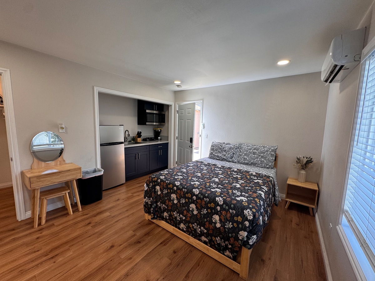 New construction 2 Bed 1 Bath Modern Hidden Gem! This Guesthouse has its own private yard, entrance & driveway. At just under 600sqft, No stone was left un-turned when Designing this space. This open concept Home features a living area with a Sleeper Sofa, 50" Roku TV, 4 chair dining table, A Remote controlled AC & Heat system. Full Kitchen with Microwave, Oven, Fridge & Washer/Dryer. Full Bathroom with Tub & Shower. 2 bedrooms, 1 with a queen bed & the other w 2 twin beds.