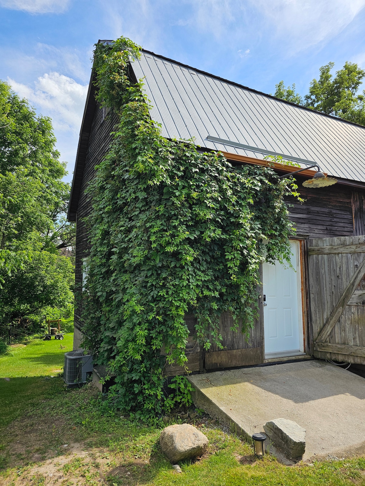 A personal retreat or a romantic getaway awaits you! The barn/studio open concept is adorably decorated with antique finds and modern amenities. During the day explore the countryside and discover farmers’ markets and unique shops and bakeries just a short drive away. Or just stay in and relax in the private outdoor barrel sauna followed by a spa-like shower with the 16" rainhead. Peaceful evenings will have you relaxing by the campfire with unforgettable sunsets and beautiful star filled skies.