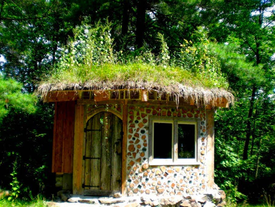 Cordwood cabin with a natural living roof overlooking a glade in the forest. Private, cozy, and wonderfully quiet. It's a fairy tale place for adults! With its table for two, hexagonal window looking out onto the pines, tiny wood stove that belts out the heat, and whimsical window seat that becomes a bed at night, this cabin has everything you need to be warm and comfortable.