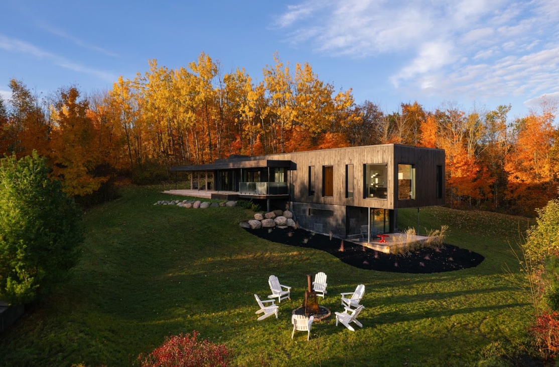 A calm lake chalet in wood, between two regional parks, minutes walk from nature trails and off the beaten path. East windows let the happy morning light on natural materials and heated floors. In the evening, a cozy cinema with ambient sound by a fireplace, a second media room with a turntable ideal for music. Outdoors, a hot tub, a wood-burning sauna, a fireplace by the lake and a slide. Cross-country ski, snowshoe trails are minutes’ walk, and snowmobile routes start right at the driveway.