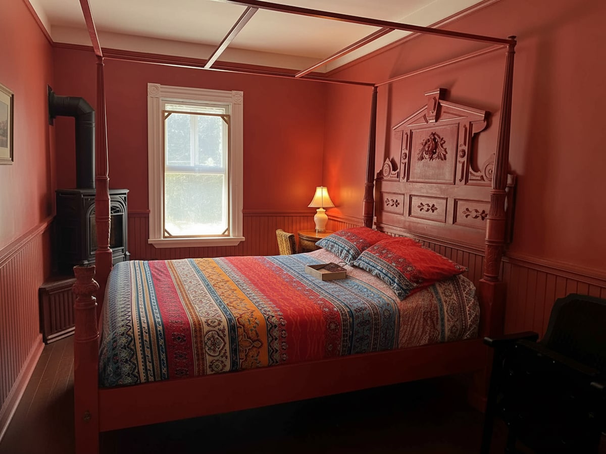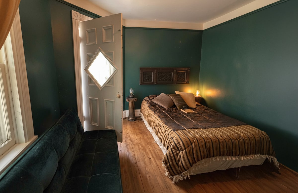 Experience the Green Musician’s Room at Le Salon des Inconnus—a cozy, creative retreat in a beautifully preserved 1898 Victorian manor. Enjoy vintage charm, professional headphones, and a guitar for your own musical sessions. Perfect for artists, families, and travelers seeking inspiration and connection in a lively, communal, art-filled inn.