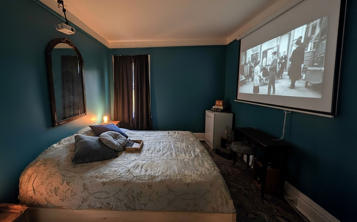 Experience the Cineast Blue Room at Le Salon des Inconnus—a cozy, cinematic escape in a beautifully preserved 1898 Victorian manor. Surrounded by vintage film décor and calming blue tones, enjoy private movie nights with your own projector and silver screen. Perfect for film lovers, artists, and families seeking inspiration and a touch of history.