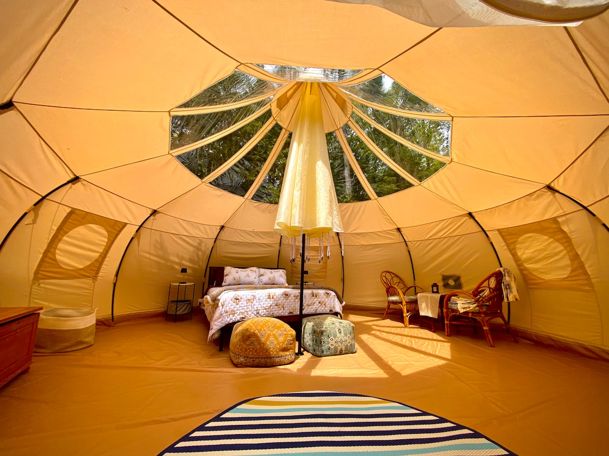 A breathtaking view, surrounded by nature in a unique & peaceful setting, you will have it all! Enjoy a beautiful ADULT ONLY destination where you will truly find peace, tranquility & privacy. A luxury bell tent, "The Hip Gypsy" (1 of 3 tents), is beautifully appointed, spacious, & set in a picturesque clearing. There is a charming outdoor kitchen & private washrooms. A short trail brings you to Indian Point, one of the best private elevated views on the island. Truly an island oasis!