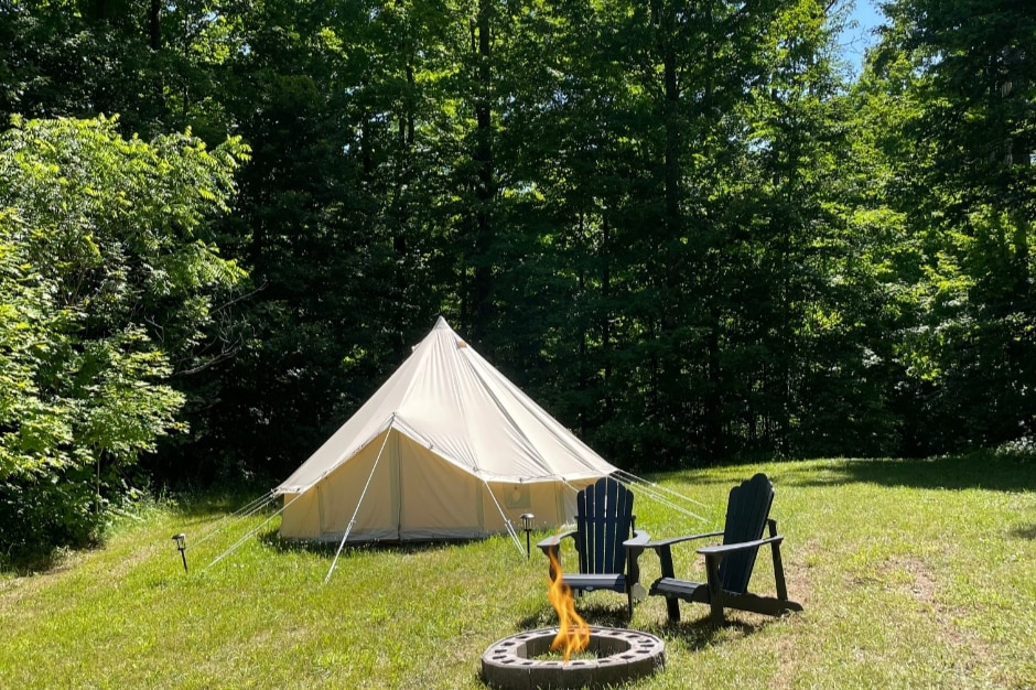 Get away and stay under the stars. In your private Glamping Tent. Enjoy a shared woodfired sauna and hot tub, followed by cold plunge. Only 45 minutes north of Toronto we offer a respite from the hustle and bustle. As the night falls, gather around a crackling, fire pit, swapping stories and laughter under the starry sky. When culinary inspiration strikes, a shared kitchen is at your disposal, providing all the necessary tools to craft a delightful meal to savour under the open sky.