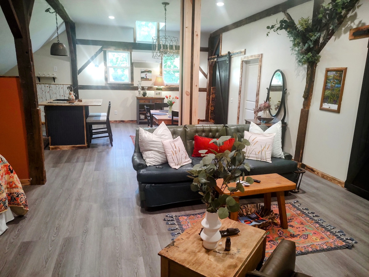 Unique 950 SQ ft of private space above our barn home in the quaint village of Naples. Close to dining, breweries, wine tastings (several local) and boutiques. Some of the best the Finger Lakes has to offer. Venture out enjoy a nice walk, hike, fishing, boating, biking & music venues . Steps from the famous Naples Grape Festival end of September. Grill on the deck and at night, enjoy roasting s'mores by our fire pit. A full continental menu arranged ahead so you may enjoy whenever you're ready.