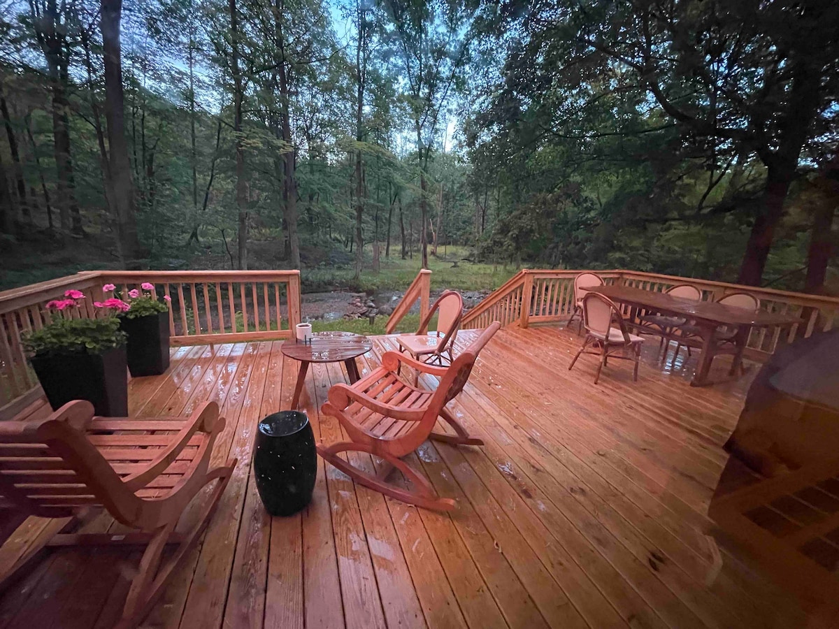 The Creek House: a fully renovated 1 bdrm, 1 bath home with a full modern kitchen and large new deck situated right next to a year round babbling brook. The creek is 15 feet from the foot of the deck stairs; its sounds lull guests to sleep each night. Frogs, salamanders, crayfish, and all manner of forest life abound. The stream meanders through the mixed park like and wooded parcel ending at a 25’ wide 6’ high waterfall. Antique clawfoot tub. Water may have a sulfur smell (see below).