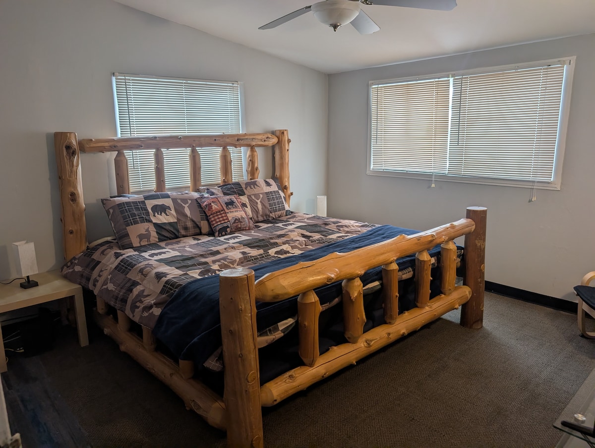 Two queen beds. Private loft bedroom with vanity sink, dresser and closet. Real kitchen with refrigerator, electric range and oven, microwave, toaster oven, coffee maker, dishes, pots and pans. Matching recliners face the 65 inch TV. Top floor, end unit, second story window looks out at your car in the well lit parking and Big Powderhorn Ski Mountain across the road. One bathroom with tub/shower. Daylight LED track lighting on the high ceilings to brighten your day.