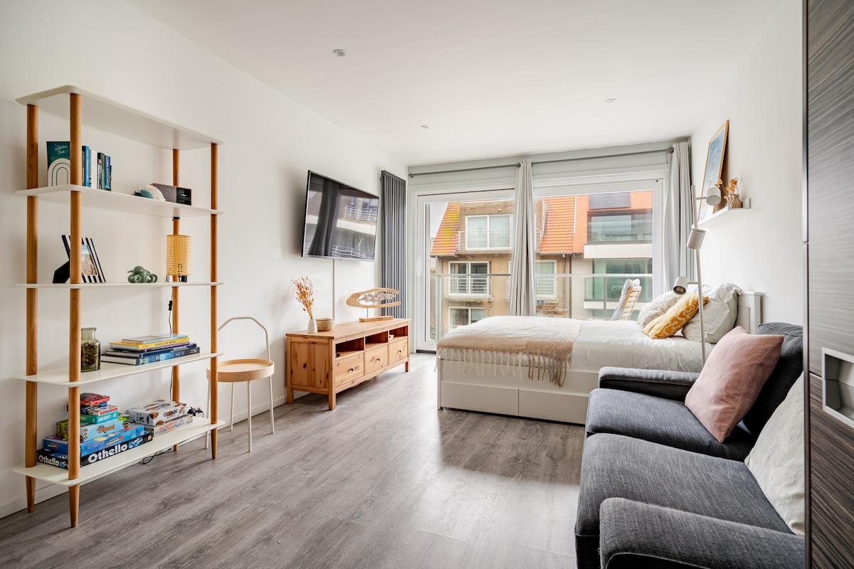 Vanuit deze perfect gelegen thuisbasis ligt alles binnen handbereik. Winkels, Restaurants, terrassen, duinen, strand, dijk, zeilclub, mini golf, open zwembad. Betalende Parkeer gelegenheid voor de deur. Gratis parkeren op ongeveer 500m. De studio is uitgerust met dubbel bed in de kast en uitklapbaar zetelbed voor 2 personen. Slaapgelegenheid voor 4 personen. Volledig uitgeruste keuken. 4 Vitrokeramische kook platen, oven.Praktische vernieuwde badkamer. Tv in de zithoek.