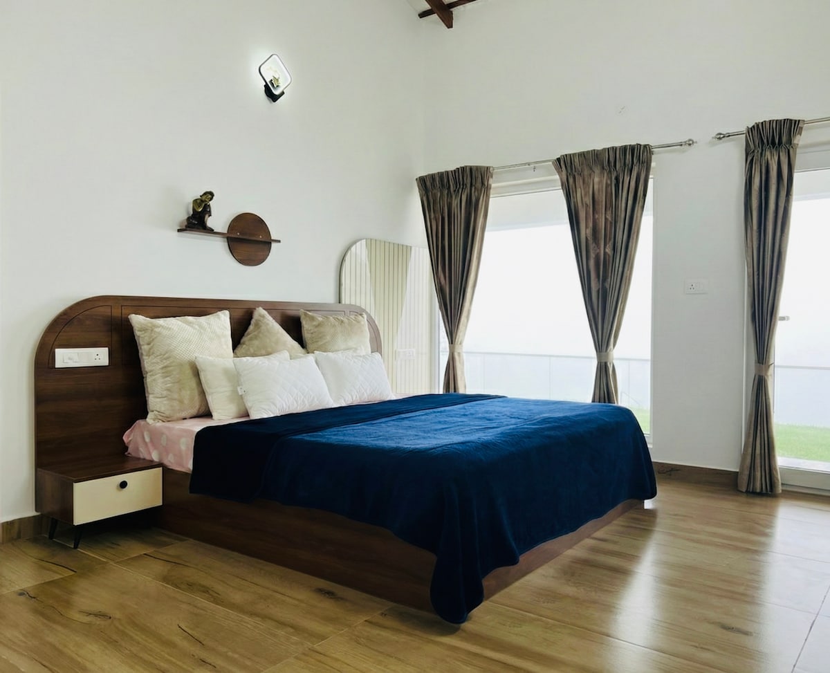 A private 1986 cottage, reimagined as a soulful retreat. It sleeps 6 to 8 adults in 3 private bedrooms. One room features premium teak stacked double beds, sleeping 2 or 4 based on your choice. As the sole home on its lane, it offers true quiet 3km from Charring Cross. The 2500 sq ft lawn is your front-row seat to misty dawns, sunlit afternoons, and crackling bonfires. Watch the stars rise over Ooty's twinkling lights below. WFH ready with 100Mbps & 24x7 2kVA backup.