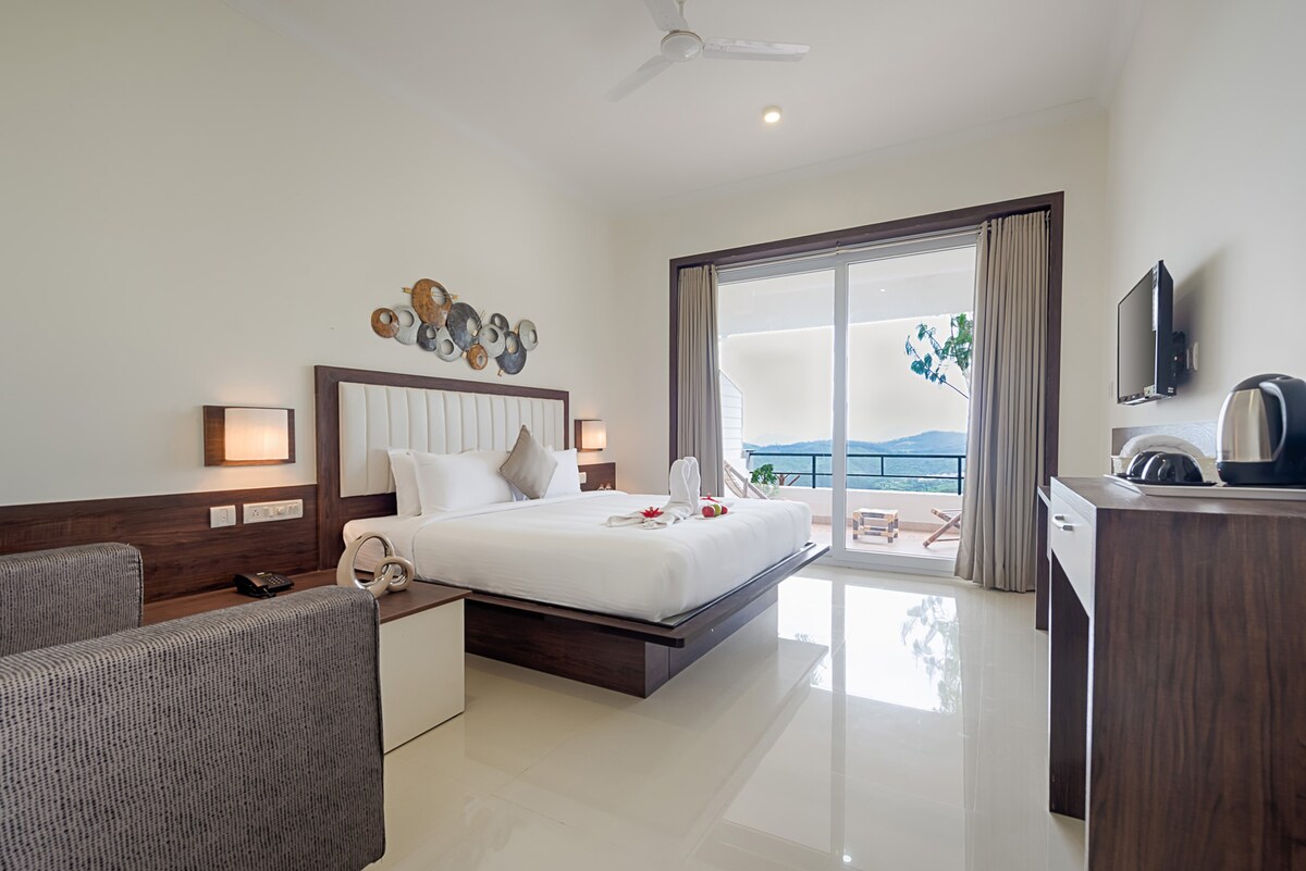 Unwind in our serene room with stunning hill and framing views from your private balcony, where you can connect with nature. The room is equipped with modern amenities, including Wi-Fi and TV, to keep you entertained and connected. Our dedicated housekeeping team ensures the room is spotless and cozy, providing a comfortable space for reflection and relaxation. Enjoy the fresh air and scenic views from your cozy balcony.