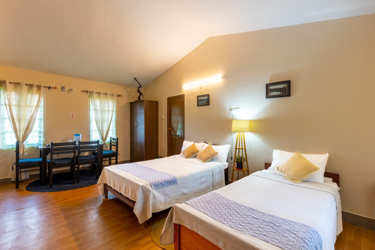 PLEASE NOTE: TARIF QUOTED AND DISPLAYED IS FOR A SINGLE BUNGALOW. Please Check the link 👇 Occupancy Bunglow 1. Guest Max 8 by providing 3 extra beds free Bunglow 2. Guest Max 8 by providing 3 extra beds free Studio Apartment Guest Max 8 by providing a bunker bed Please click bellow links for individual units BUNGALOW 1 https://air.tl/QUfxG9IQ BUNGALOW 2 https://air.tl/ZY4ygxwo STUDIO APARTMENT http://airbnb.co.in/h/studio-6person