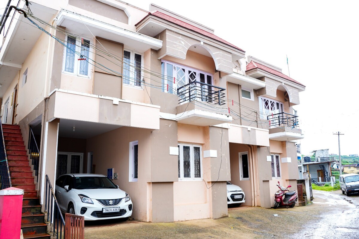 2 bedroom apartment on the Ground floor of a house located almost on top of a hill in a quiet residential neighborhood(away from the hustle and bustle of town)with very scenic views and about 15 min walk from the town centre.Breakfast NOT provided but one can order or self cook, for other meals one can order from the various delivery options available in town.The view from EVERY ROOM is of the doddabetta peak,the highest peak in south india.There is a small lawn accessible to guests too
