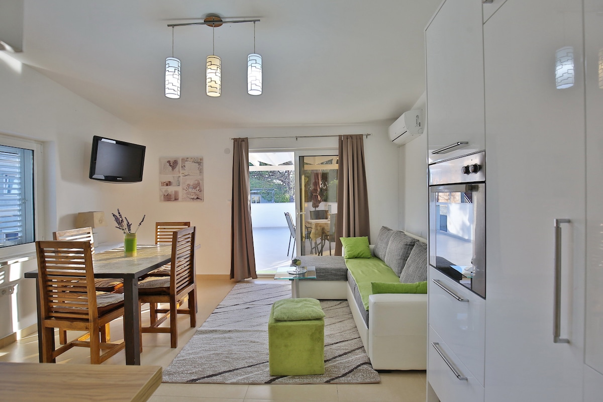 Top Apartment with air conditioning and kitchen with ceramic hob and dishwasher quiet gelegen.Das Apartment is located only 600 meters away from the pebble beach with 2 volleyball courts and dive center. There are also two coffee-bars and there are always programs and DJs (URL HIDDEN) make. 10 kilometers away is the beautiful city of Zadar, with its world famous Sea Organ and Kathedrale.Desweiteren they can take a boat tour of the Natural National Park Kornati, or by car to the Krkawasserfällen (Bill Gates every year come by boat and visited them) or the Paklenica National Park where Winnetou was shot.