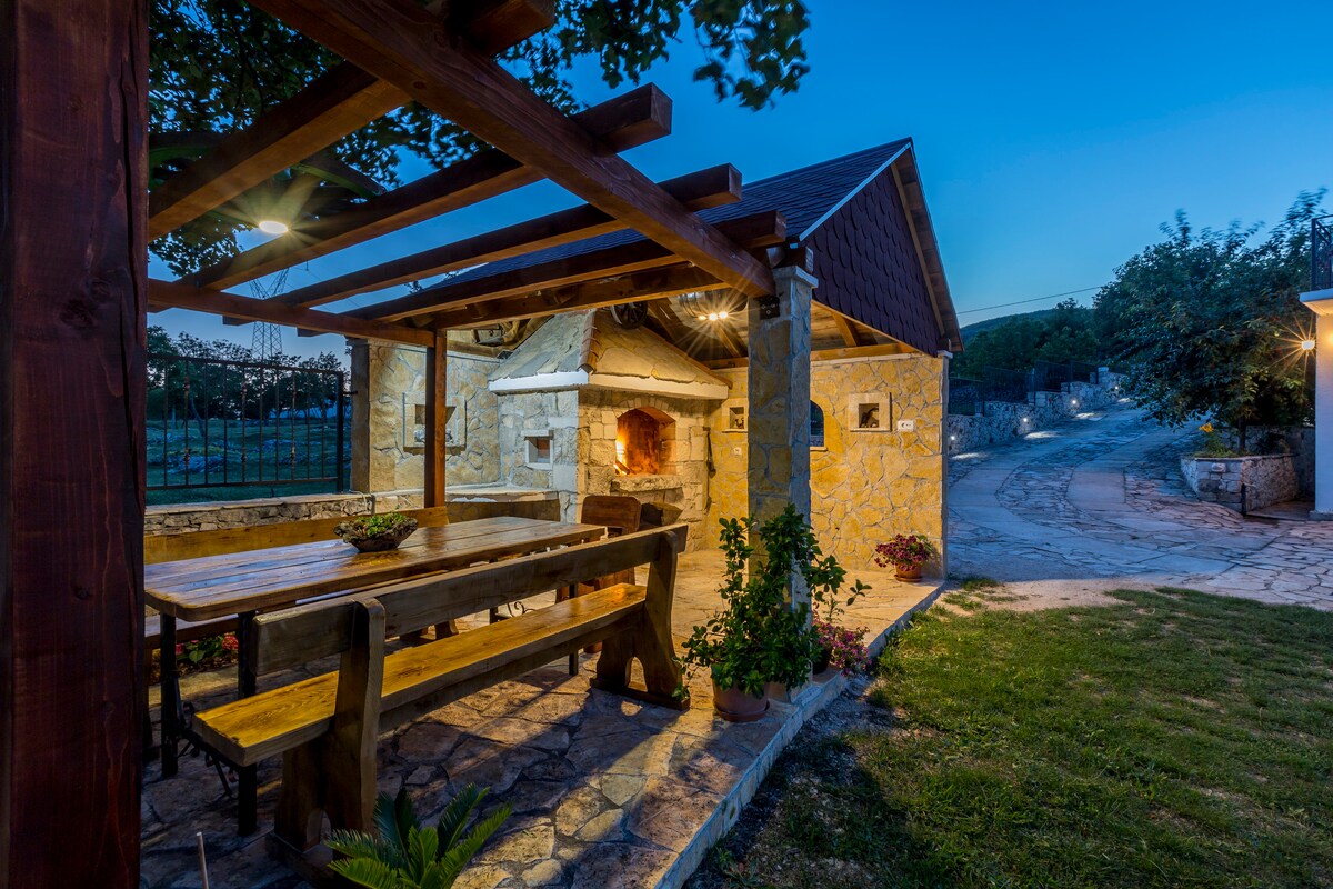 Prekrasna kamena kuća od 160 m2 u prirodnom okruženju s privatnim natkrivenim parkingom i ograđenom okućnicom od 500 m2 na kojoj se nalazi grijani bazen, ležaljke, suncobrani, vrtne garniture i stolni tenis. Ispred kuće je stol za 8 osoba i roštilj. U prizemlju kuće je kompletno opremljena kuhinja, dnevni boravak s prirodnom stijenom,blagavaona i kupatilo. Na katovima su po dvije sobe s bračnim krevetima,tv i klima uređajima te kupaonicama. Svaka soba ima izlaz na balkon s prekrasnim pogledom.