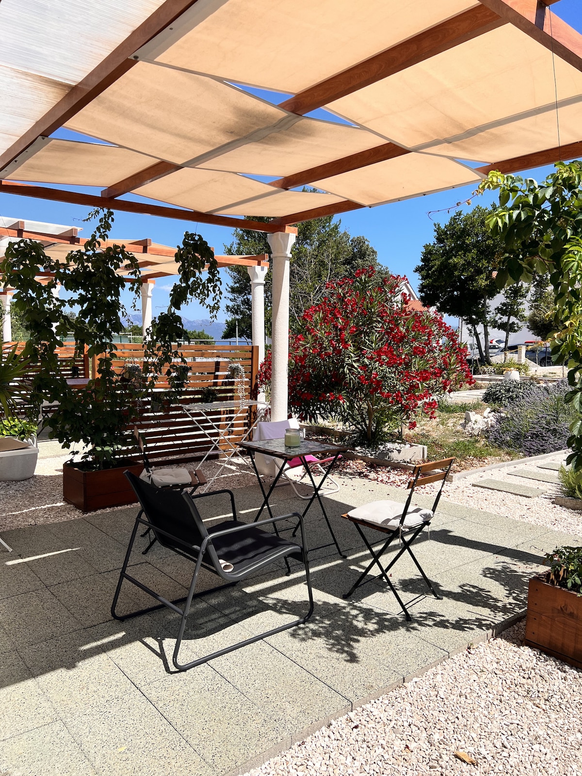 Charming and cozy apartment. Our new and comfortable one-bedroom apartment with a big outdoor terrace is ideal for your peaceful vacation. It is located on a quiet street only one minute walk from the sea. The apartment has its own parking place, separate access and entrance directly from the parking. Also, the apartment has its own private terrace.