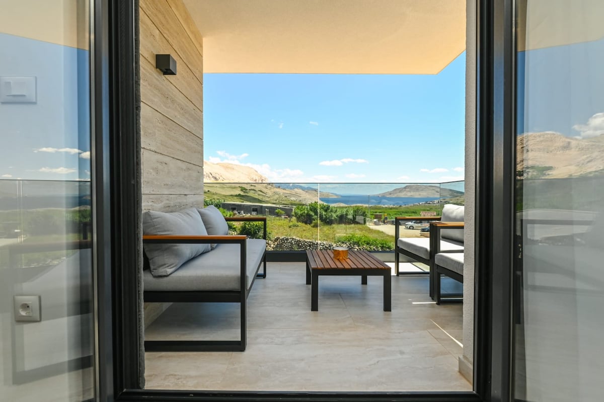 Perched on steep rocks, 30m above the sea level, this idyllic studio is a perfect getaway for a much needed vacation. Surrounded by a vegetation reserve of Dubrava-Hanzine, it offers a luxurious experience - the sweeping views of the Pag Bay and the mountain range of Velebit, for one. Beach Rozin Bok 50m from the apartment. Parking, A/C, outside grill, and outside solar shower included. SUP and kayak are available during the stay in the apartment.