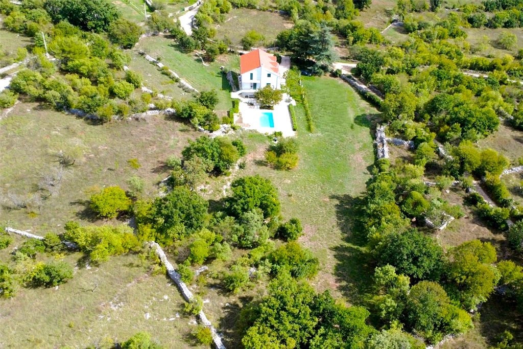 Ova kuća se nalazi u mirnom okruženju, izvan grada ali u njegovoj blizini. Panoramski pogled omogućit će vam opuštanje kako bi zaboravili na užurbani život u gradu te na buku i stres koje gradovi donose. Kuća se nalazi na zemljištu od 1500 m2, a od najbližeg susjeda je udaljena 100 m što vam omogućava punu privatnost. Ispred kuće uz privatni, grijani, panoramski bazen, dostupan od sredine travnja do kraja listopada, nalaze se prostrane uređene, otkrivene i natkrivene terase. Parking slobodan.