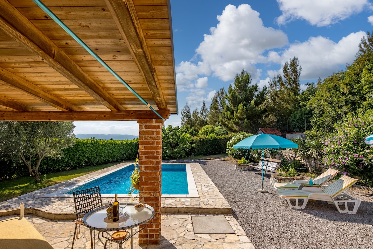 Villa se prostire na 297 m2 sa ukupno 1540 m2 okucnice i bazenom od 48 m2, dubine 1.5 m. Objekt moze primiti max. 8 odraslih osoba. Objekt je smjesten u zelenoj oazi, koja pruza potpunu privatnost od pogleda. Objekt ima saunu i jacuzzi s pogledom na more. Check in i check out je subotom (srpanj, kolovoz, rujan), dok je za ostale mjesece na upit.