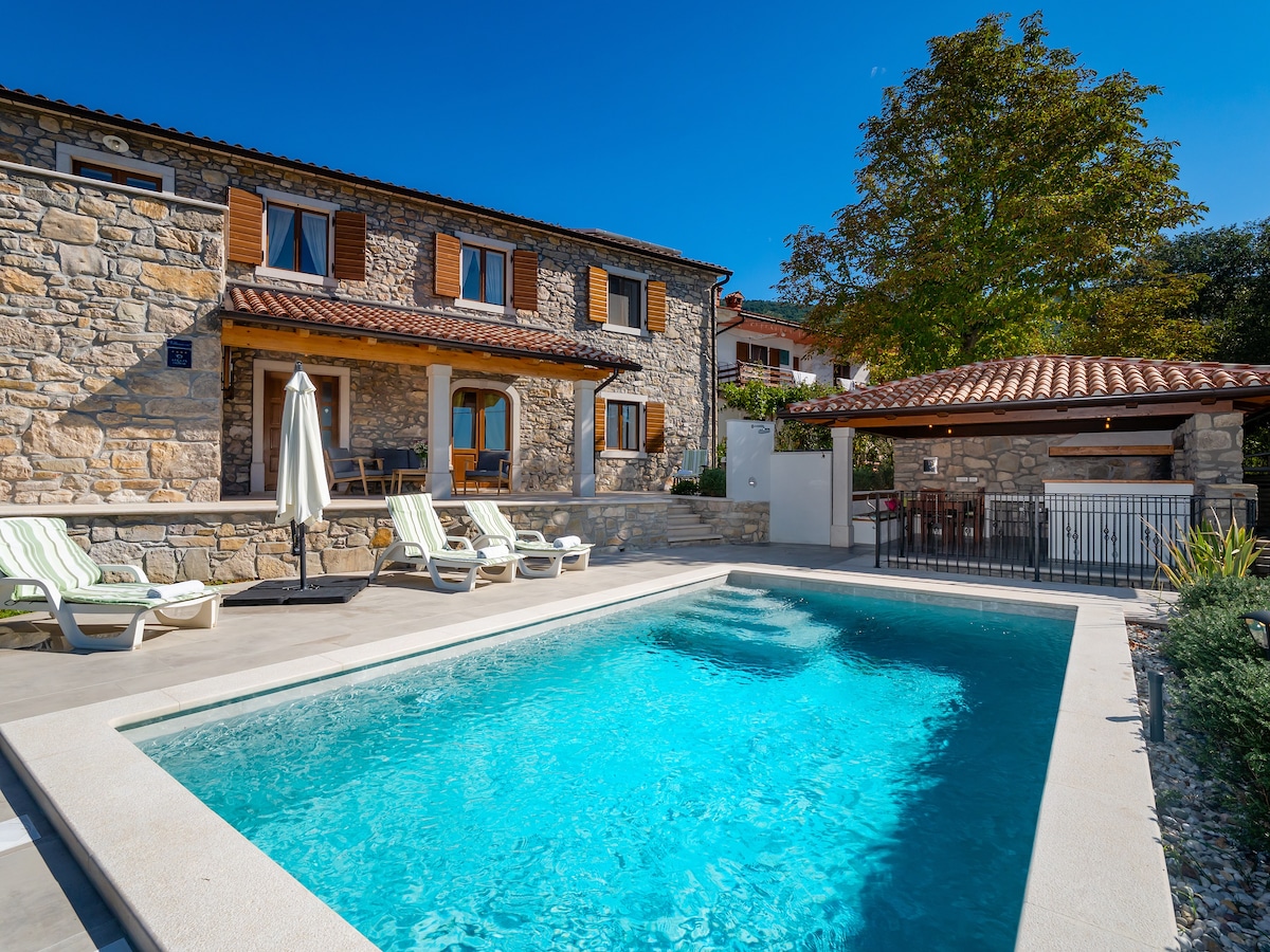 Villa Maru is nestled in the picturesque village of Brseč, perched on an elevated position above the Kvarner Bay, offering breathtaking views of the sea and the island of Cres. This spacious and elegant villa provides the perfect setting for a relaxing holiday with family or friends, combining ultimate comfort with complete privacy. Accommodating up to 12 guests, the villa boasts six spacious bedrooms, each radiating warmth and style.
