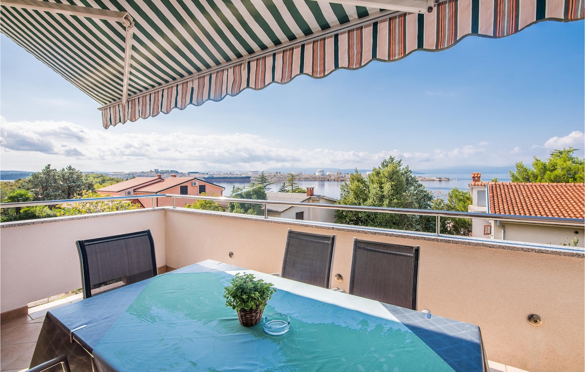 The apartment is located on the secon floor with a huge terrace that has an unobstructed view over the Kvarner bay. You can enjoy this spectacular view from your dining room, master bedroom and secondary bedroom. The beach is only 200 meters away. The apartment consists of: Main bedroom with comfortable Queen size bed The secondary bedroom has two single beds and a work desk Kitchen with a dining table. Bathroom Terrace and a balcony One parking space and WiFi are available and free to use.