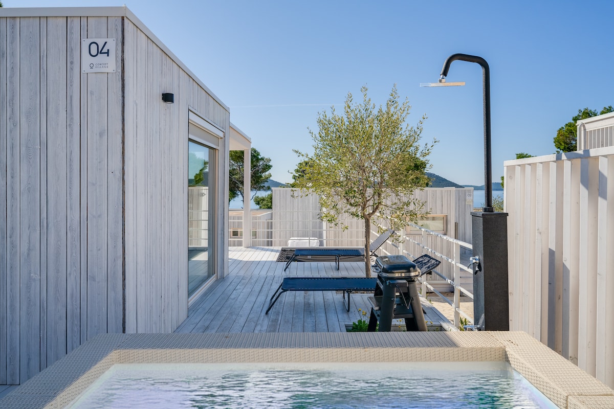 The Rooftop Terrace is just above the Penthouse and it spreads over the entire villa with its surface. It's spacious and it comes with lounge area, sunbathing area, outdoor shower, bar and jacuzzi. Book this unique space just for yourselves and enjoy complete privacy while embracing the stunning seaview of the bay archipelago and 360 panoramic view of the town. Enjoy the sunset!