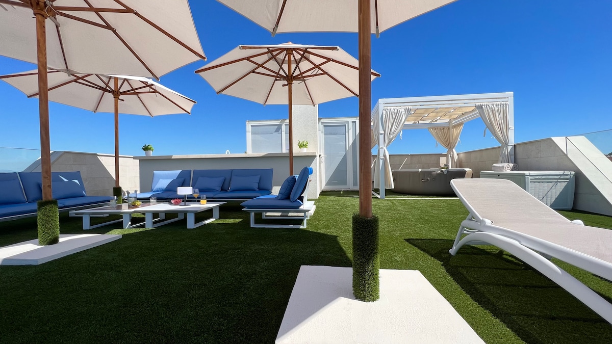 The Rooftop Terrace is just above the Penthouse and it spreads over the entire villa with its surface. It's spacious and it comes with lounge area, sunbathing area, outdoor shower, bar and jacuzzi. Book this unique space just for yourselves and enjoy complete privacy while embracing the stunning seaview of the bay archipelago and 360 panoramic view of the town. Enjoy the sunset!