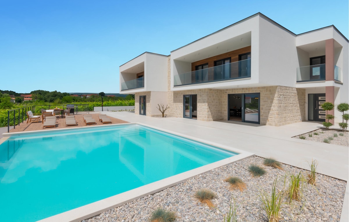 The villa has 4 spacious bedrooms, two of which have bathrooms making it perfect for families or groups. The living area is bright and open, with large windows. The modern kitchen is fully equipped for cooking and dining. Outside, there's a barbecue grill, ideal for enjoying the scenery. Swimming pool, sun loungers and seating areas are ideal for relaxation. This villa offers a combination of comfort, convenience, and stunning views, providing an unforgettable vacation experience.