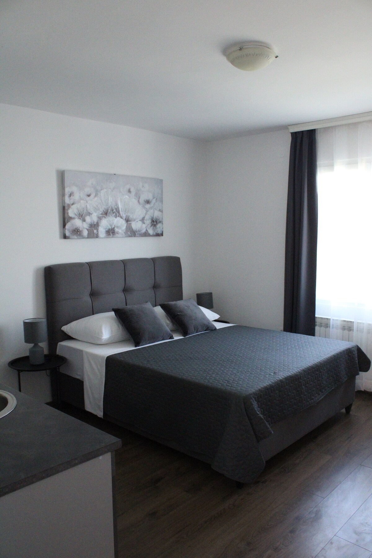 Villa Almaro is an exclusive 4-stars holiday property and part of Dedaj Resort, a brand new luxury holiday experience in Zadar, Croatia. Our villa has 8 modern and stylish apartments, all with the best features of a new-age smart house. This studio apartment is located on the ground floor of the property and is comfortable for 2 guests. The features include a large double bed, air-conditioning, free Wi-Fi, a shared pool area with a sea view, a lounge zone next to the pool, gym, and more.