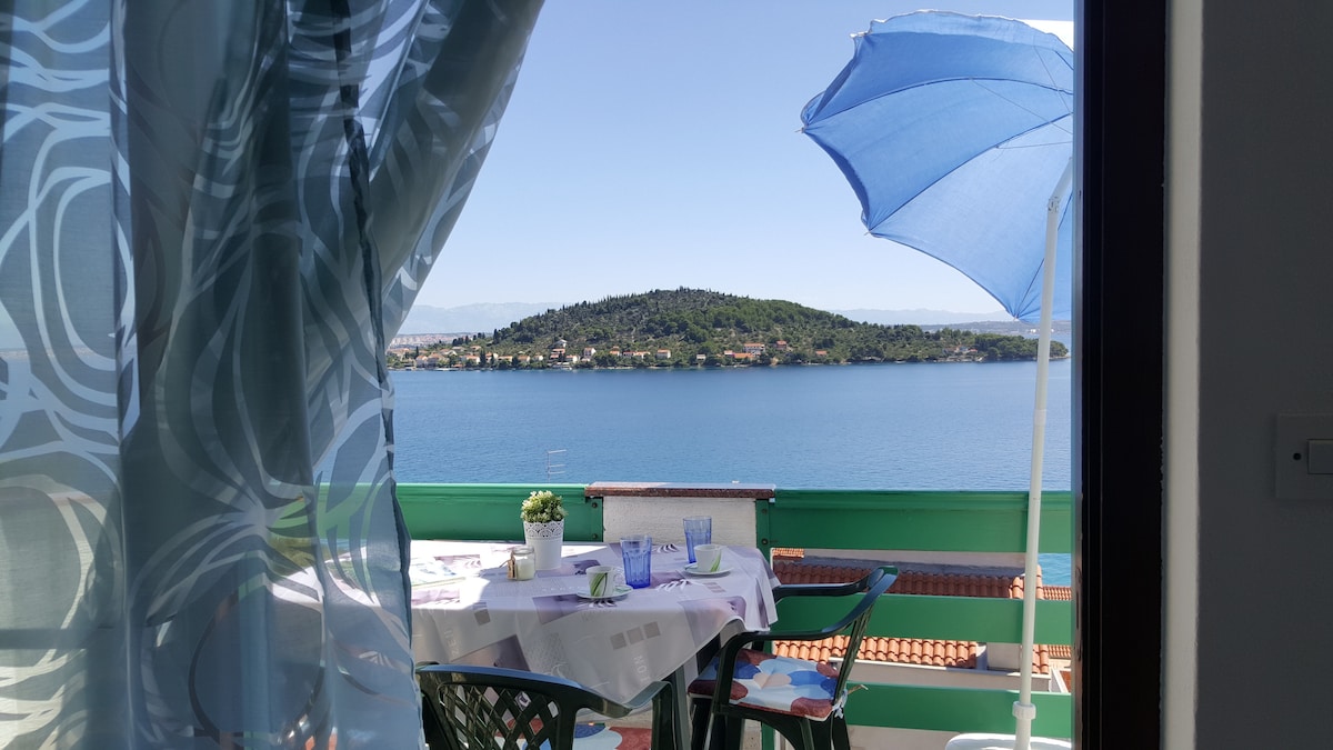 Apartment (40m2 for3 persons) Big terrace with beautiful view. In Diklo,10 m from the sea/beach. Shop & restaurant 50 m, sandy beach 200 m. 70 m from the centerParking & bus station in front of the house. ..This house is located in the center of Diklo.and so is the beach,across the apartment.the tennis court and the restaurant Taverna 50 M RANGE FROM THE HOUSE, as well as 2 caffes are located within 50m range from the house.the sea and the first beach are located right across the apartment.